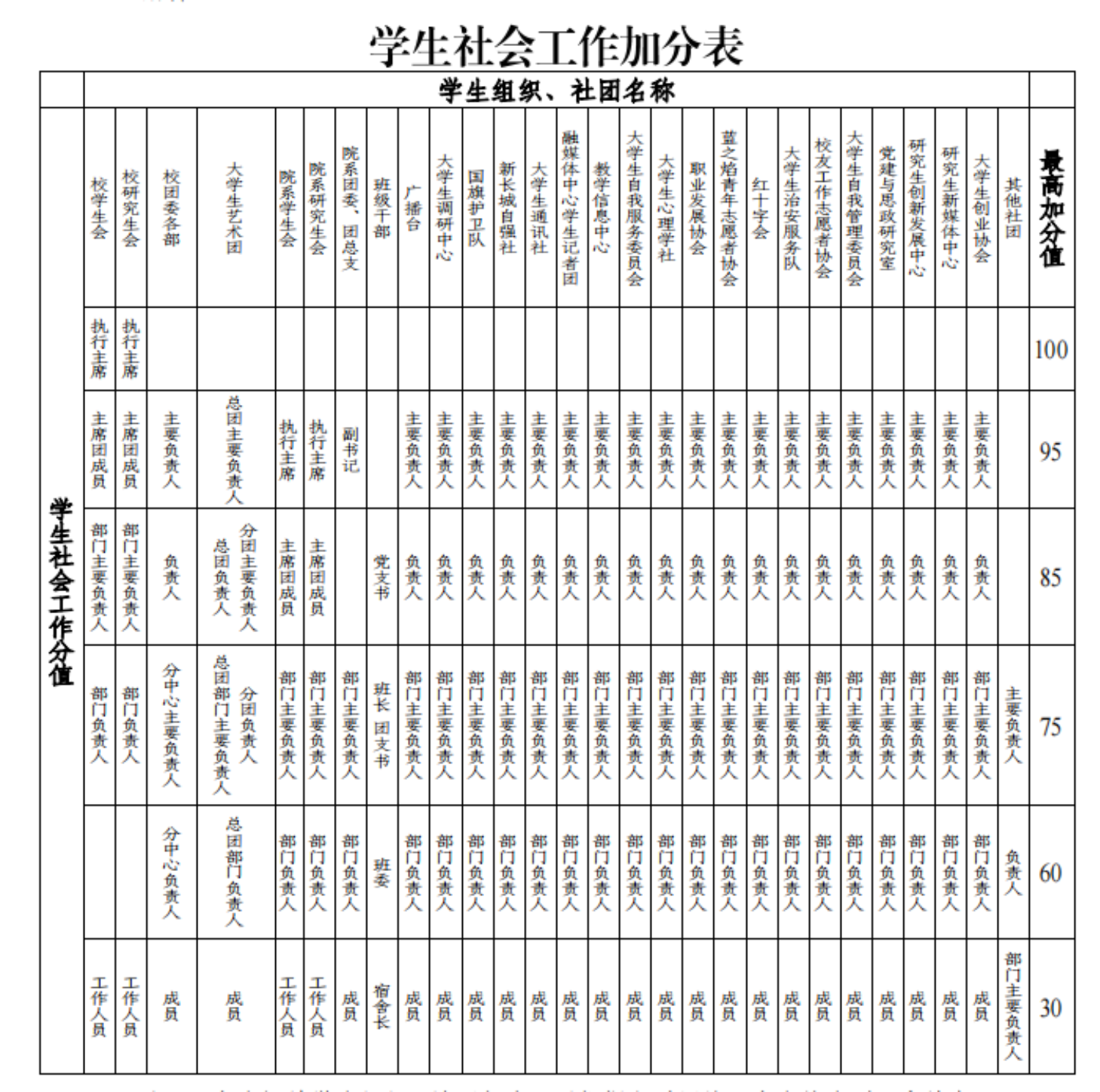 4. 上表加分规则对应以班级为单位的党支部,班级党支部中其他委员按照班长、团支书的加分标准计算员工社会工作分值;以为年级为单位的党支部或纵向党支部,党支部书记(副书记)按最高加分值 95 分计算,党支部其他委员按最高加分值 85 分计算。
